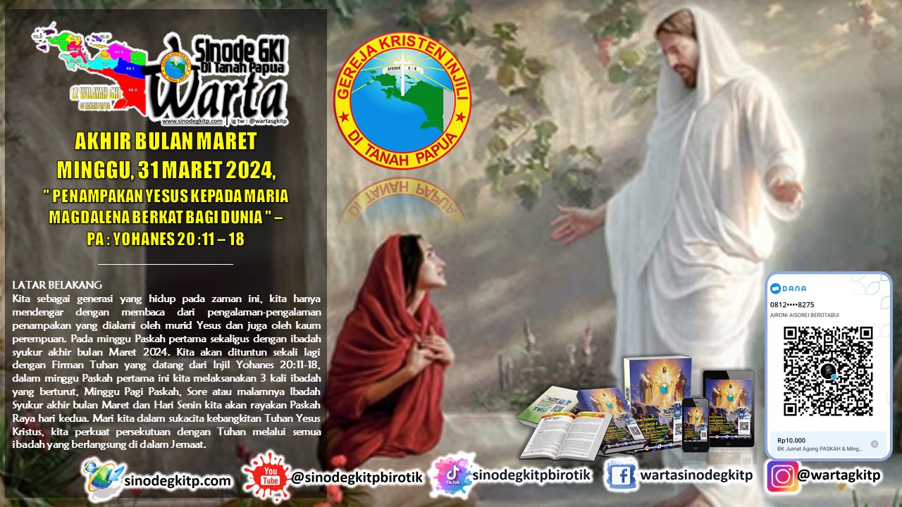Kita sebagai generasi yang hidup pada zaman ini, kita hanya mendengar dengan membaca dari pengalaman-pengalaman penampakan yang dialami oleh murid Yesus dan juga oleh kaum perempuan. Pada minggu Paskah pertama sekaligus dengan ibadah syukur akhir bulan Maret 2024. Kita akan dituntun sekali lagi dengan Firman Tuhan yang datang dari Injil Yohanes 20:11-18, dalam minggu Paskah pertama ini kita melaksanakan 3 kali ibadah yang berturut, Minggu Pagi Paskah, Sore atau malamnya Ibadah Syukur akhir bulan Maret dan Hari Senin kita akan rayakan Paskah Raya hari kedua. Mari kita dalam sukacita kebangkitan Tuhan Yesus Kristus, kita perkuat persekutuan dengan Tuhan melalui semua ibadah yang berlangsung di dalam Jemaat.