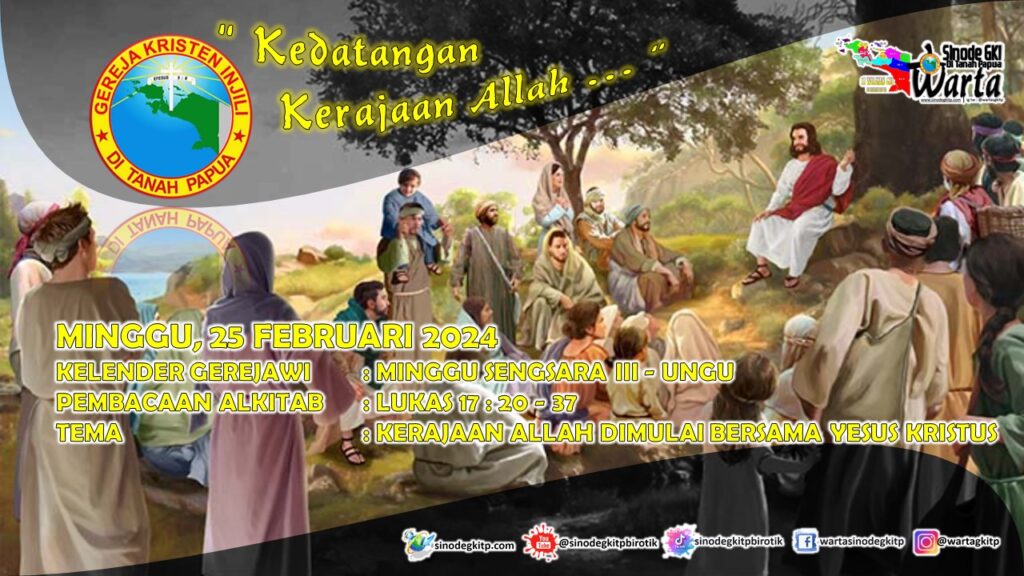 Kita sudah mencapai hari ini adalah hari ke-56, minggu ke-8 dalam bulan ke-2 Februari tahun 2024, minggu sengsara ke-3. Ini adalah minggu terakhir dari 4 Minggu dalam bulan Februari. Kita terus diarahkan kepada tema “pemberdayaan” dengan fokus triwulan 1 (satu) adalah: “TUHAN Sumber Utama Pemberdayaan”. Firman Tuhan yang mendatangi kita untuk merefleksikan makna pemberdayaan dan juga menggumuli semua karya kita sepanjang minggu ini, dari Lukas 17: 20-37, dalam situasi minggu sengsara ke- 3, kita dipandu untuk memaknai “Kerajaan Allah” yang Yesus ajarkan. Memang GKI di Tanah Papua sudah mencantumkan visi-misi teologi yang menjadi bagian dari “refleksi GKI atas intisari pengajaran Yesus kekinian secara marturia, koinonia dan diakonia dan ke masa depan sebagai pengharapan iman. Karena itu rumusan kegiatan dalam “renja jemaat, Klasis dan Sinode” selalu mencerminkan nilai dan nuansa yang khas dari tri panggilan gereja dimaksud, sebagai refleksi atas Kerajaan Allah dalam seluruh penata-layanan manusia dan gereja di bumi.
