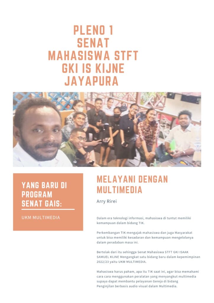 Perkembangan TIK mengajak mahasiswa dan juga Masyarakat untuk bisa memiliki kesadaran dan kemampuan mengelolanya dalam peradaban masa ini. Bertolak dari itu sehingga Senat Mahasiswa STFT GKI ISAAK SAMUEL KIJNE Mengangkat satu bidang baru dalam kepemimpinan 2022/23 yaitu UKM MULTIMEDIA. Mahasiswa harus paham, apa itu TIK saat ini, agar bisa memahami cara cara menggunakan peralatan yang menyangkut multimedia supaya dapat membantu pelayanan Gereja di bidang Penginjilan berbasis audio visual dalam Multimedia.